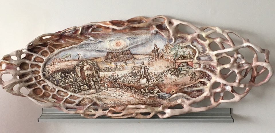 Carol Barbour. Tabula Cebetis (after de Hooghe). Oil on wood and plaster, 2018