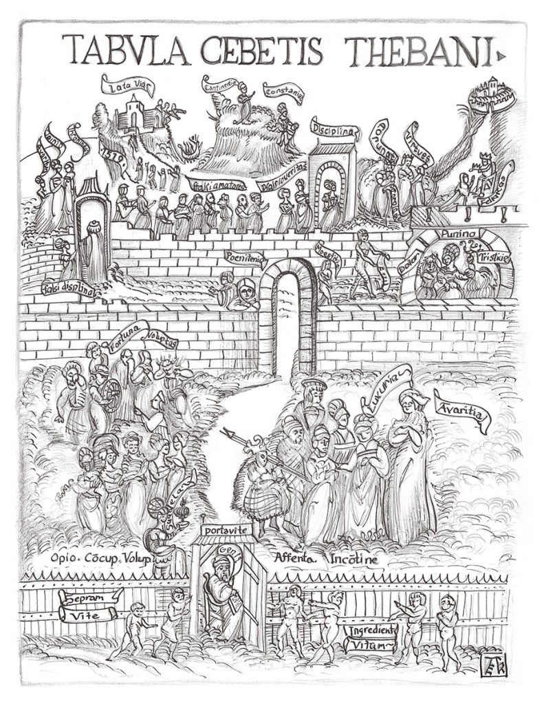 Throughout her life, Carol has worked as a visual artist, creating drawings, paintings, sculptures, and artist books. Her work has been exhibited at galleries, libraries, and books fairs in Canada, USA, and Europe. Recent creative writing projects are the poetry collection Infrangible (2018) and the artist book Alter Pieces (2019 More). Poems and essays are published by Scintilla, Canthius, The Fiddlehead, Sein und Werden, among others. Below is a selection of artworks by Carol based on her research of the Tabula Cebetis, and a couple of details from the case studies.
