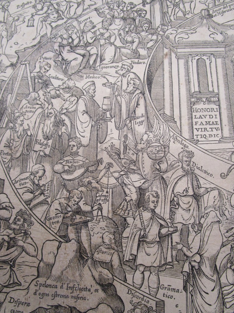 Carol Barbour is a doctoral candidate at the École Pratique des Hautes Études (EPHE-PSL). Her research project, which is supervised by Professor Sabine Frommel, studies the iconography of the Tabula Cebetis, an ekphrastic text from the 1st – 2nd century CE that was re-examined by humanist scholars in the Renaissance. Subsequently, artists created miniatures, paintings, prints, frescoes, and embroideries of the subject, and in doing so a distinctive iconographical program evolved. The images of the Tabula Cebetis depict the cycle of human life through an architectural construction of three circular rings, each part signifying a phase of development. It begins at the portal of life located at the foot of a mountain, continues to the second ring, which pertains to education and skill, and ends in the third area at the summit where Happiness (Felicitas) reigns.